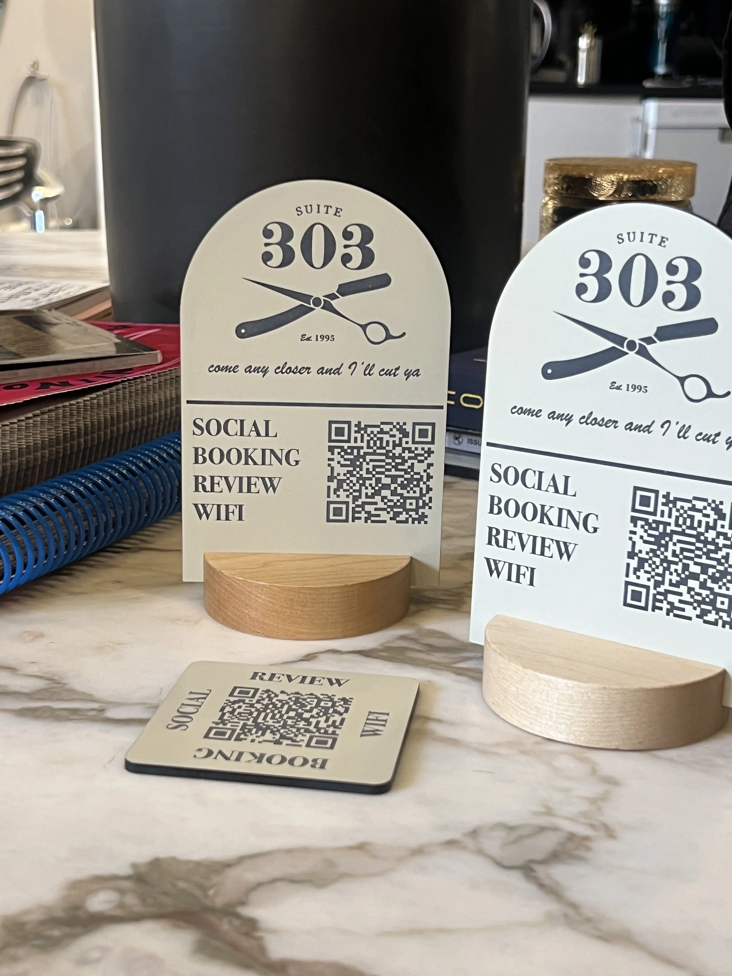 QR CODE STANDS FOR THE SALON CONNECTED TO A CUSTOMIZED APP + WEBPAGE. made in partnership with Odeko.