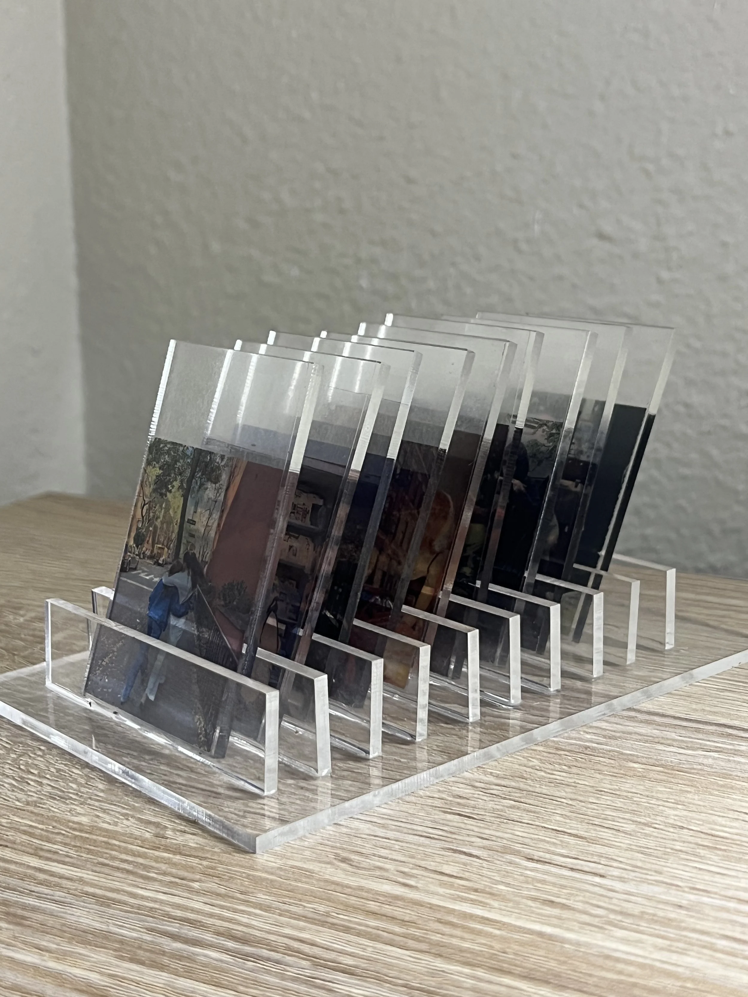 Clear acrylic holding systems to go along with each nightlight. Made to store and display photo slides, in an aesthetic fashion that makes them easily accessible for the user to store and interchange.