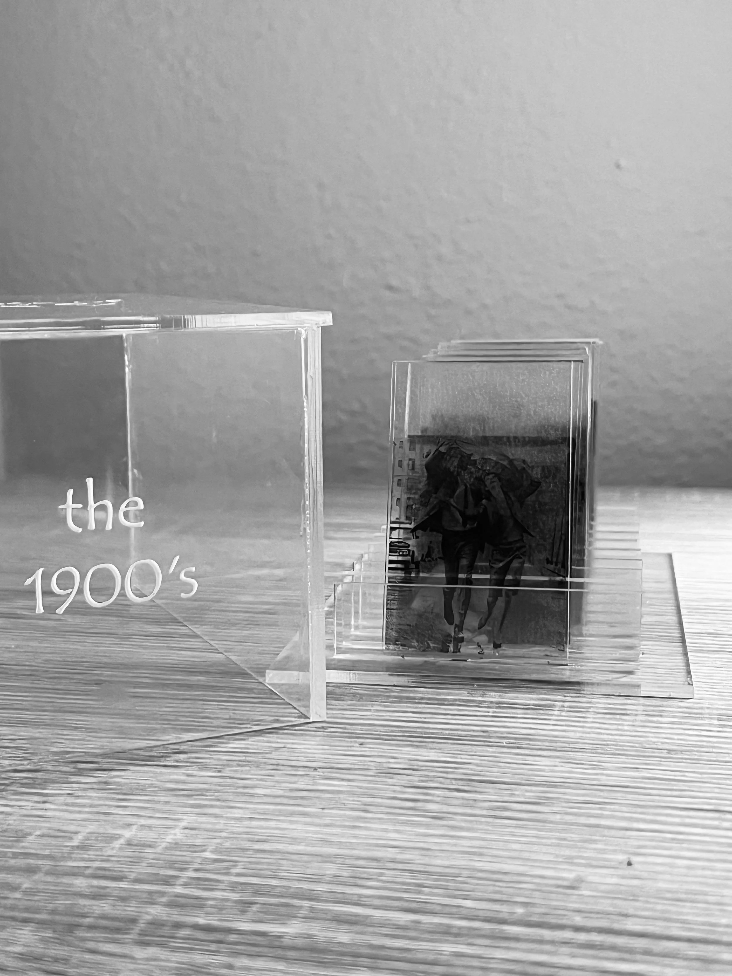 I printed each photo onto translucent adhesive sheets and stuck each onto 2.5” x 3” clear acrylic slides, which I programmed on Rhino and laser cut.